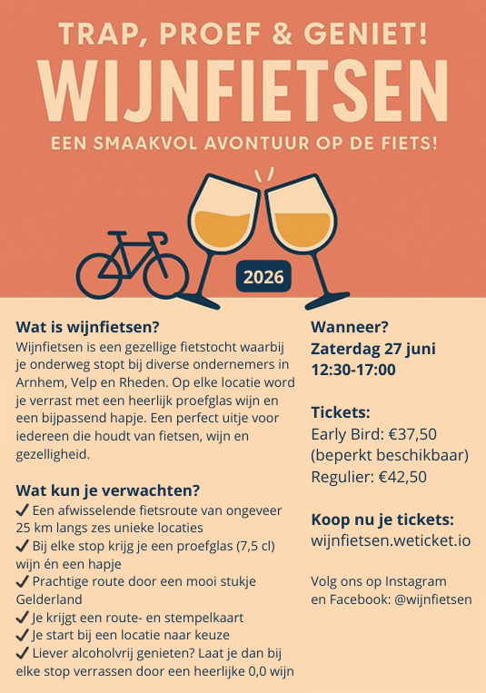 Na de succesvolle eerste editie is het op zaterdag 27 juni weer tijd voor ‘Wijnfietsen’. Je fietst langs diverse locaties in Arnhem, Velp en Rheden. De route gaat o.a. over de prachtige Posbank en is ongeveer 25 km.